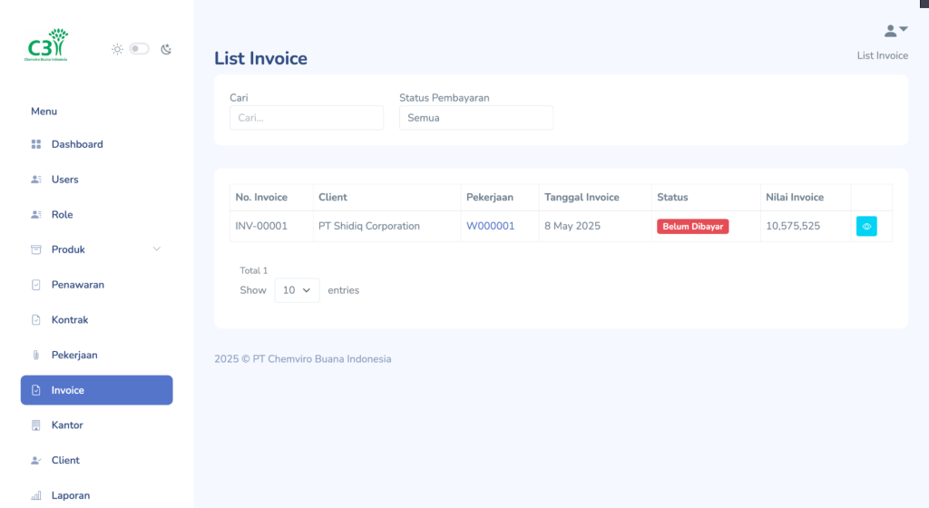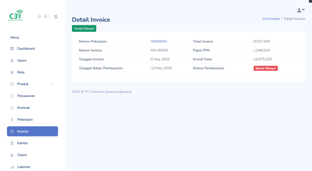 Menu Invoice digunakan untuk menampilkan, melacak, dan memperbarui status pembayaran atas pekerjaan yang sudah diterbitkan invoicenya. Hal ini membantu tim administrasi, finance, dan operasional untuk memantau arus pemasukan dan status tagihan secara real-time.