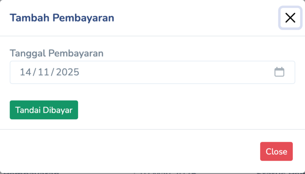Saat tombol Tandai Dibayar diklik, sistem akan menampilkan pop-up Tambah Pembayaran.