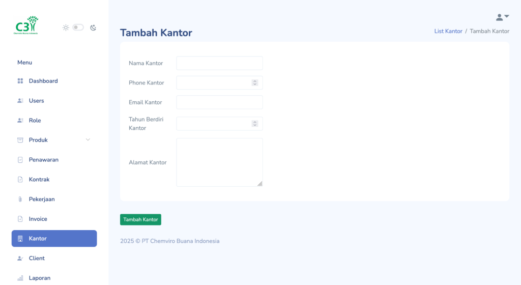 Menu Kantor digunakan untuk mengelola seluruh informasi terkait kantor pusat maupun kantor cabang perusahaan. Melalui menu ini, pengguna dapat melihat daftar kantor, menambahkan kantor baru, melihat detail kantor, melakukan perubahan data, hingga menghapus kantor.