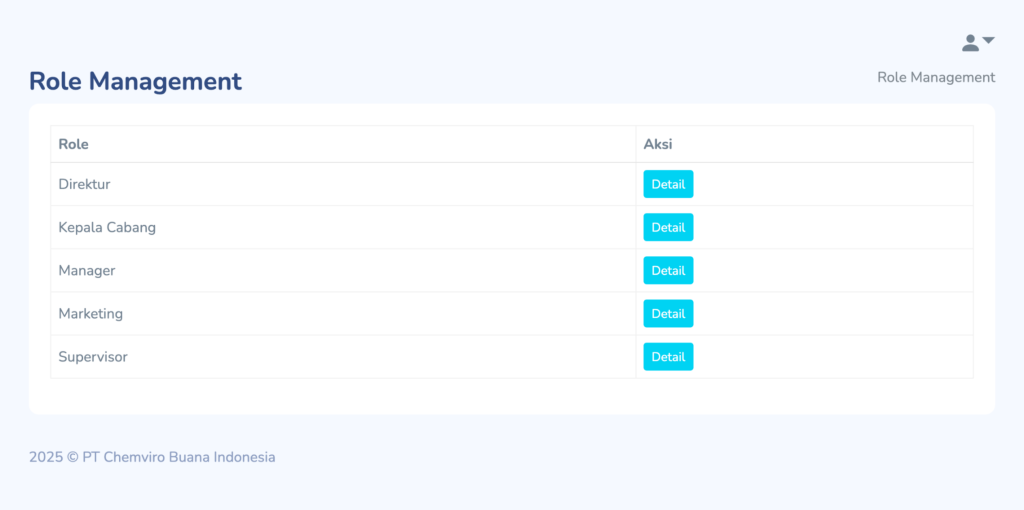 Dari halaman ini, Admin dapat membuka pengaturan setiap role dengan menekan tombol Detail.